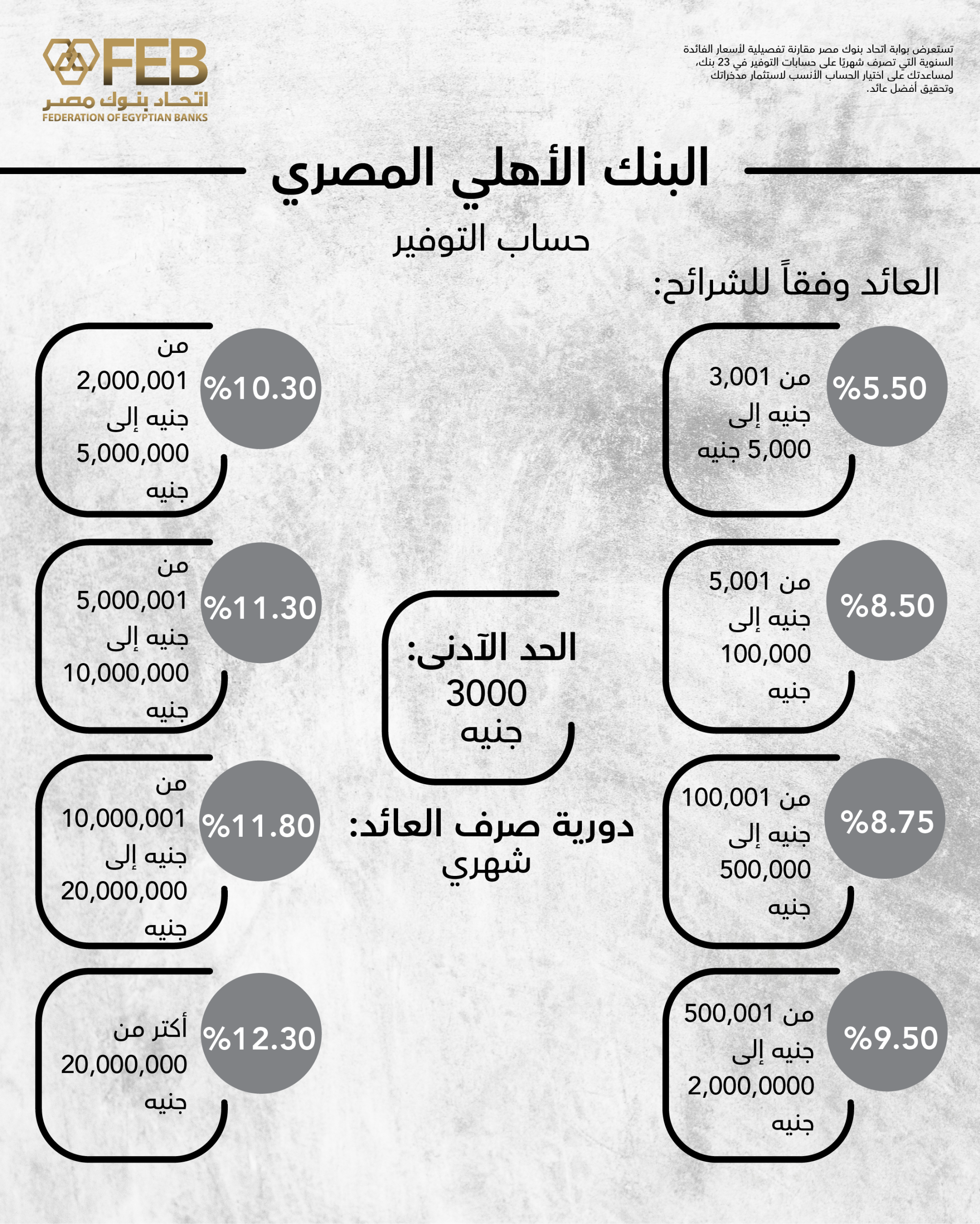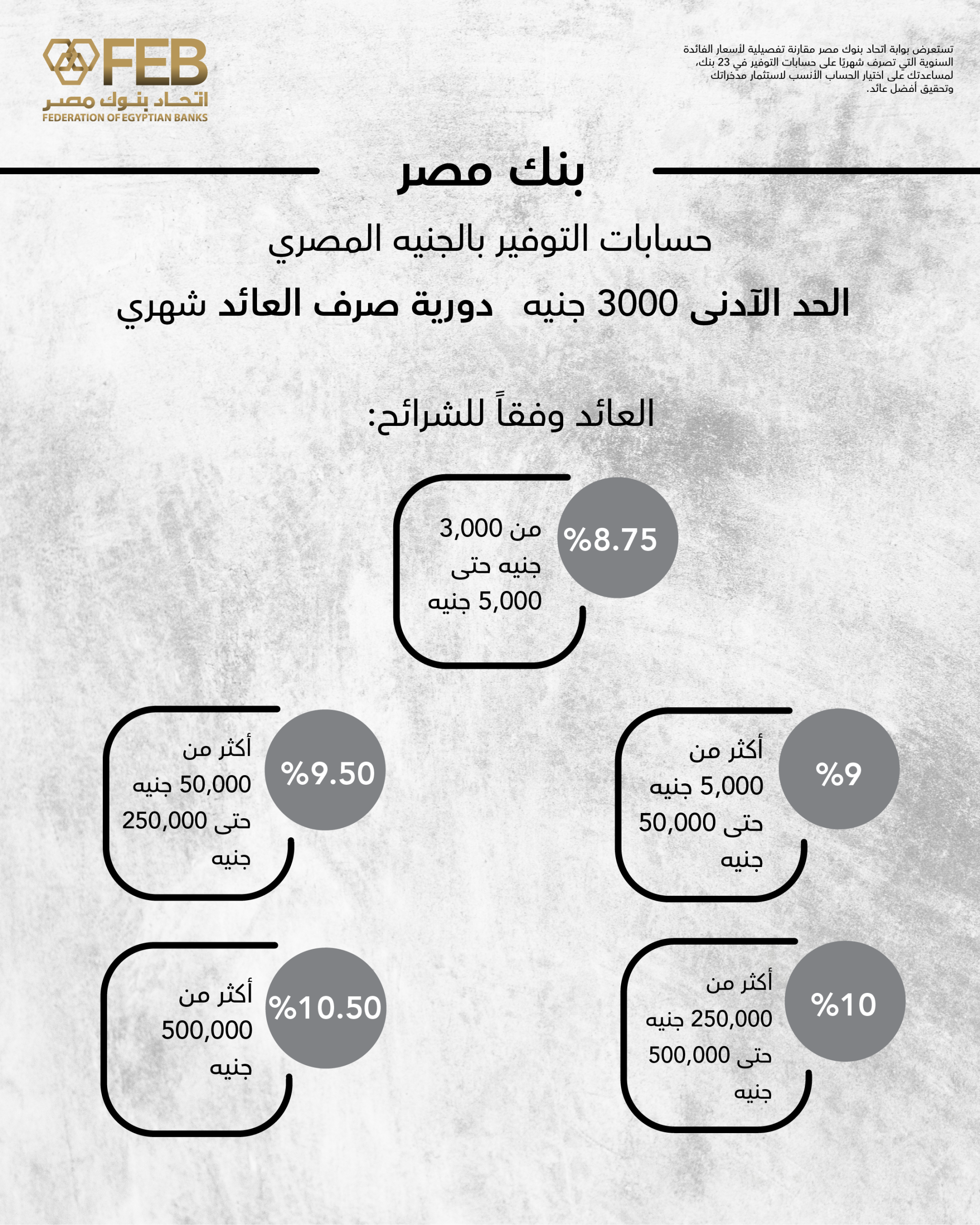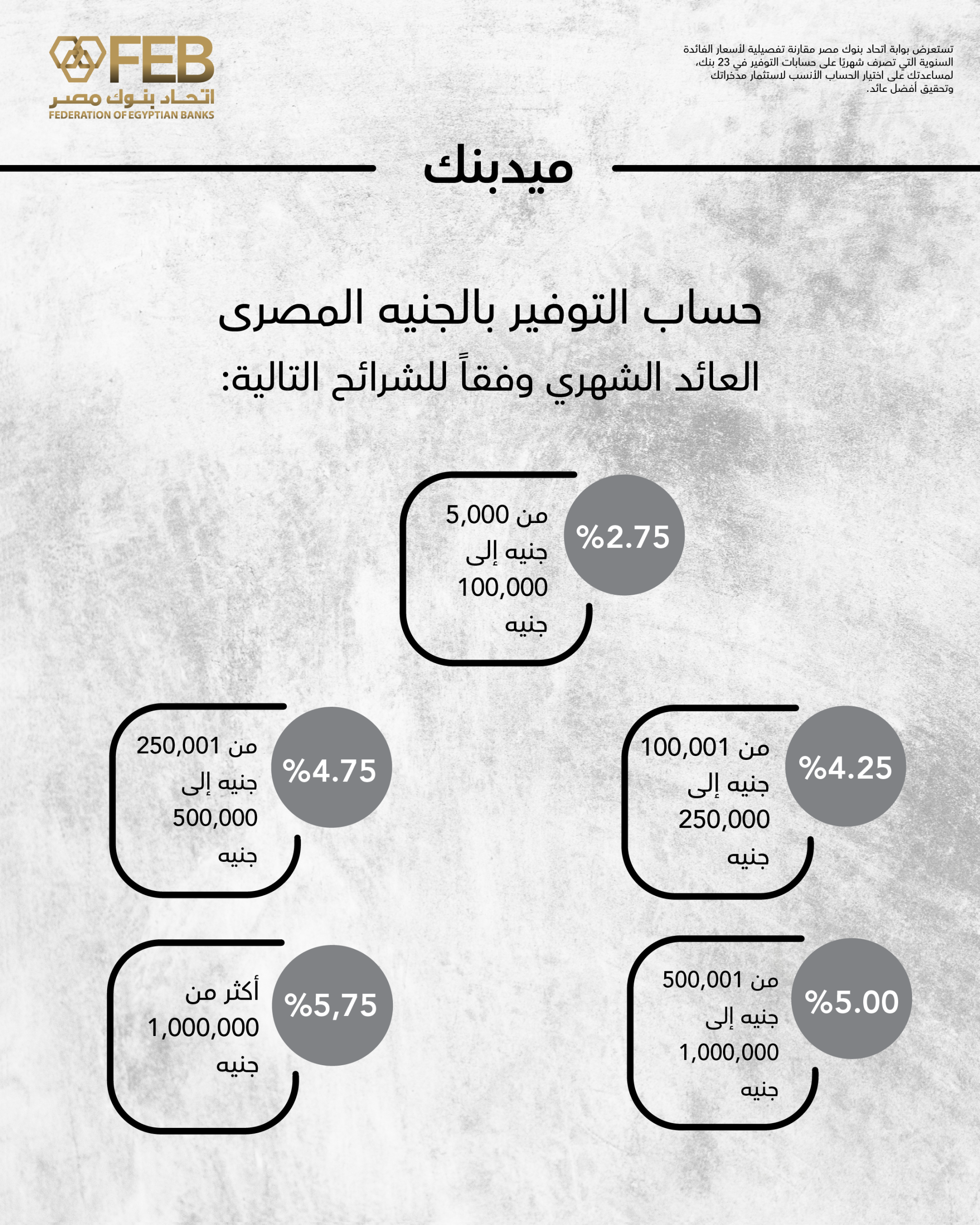 تستعرض بوابة اتحاد بنوك مصر مقارنة تفصيلية لأسعار الفائدة السنوية التي تصرف شهريًا على حسابات التوفير في 23 بنك، لمساعدتك على اختيار الحساب الأنسب لاستثمار مدخراتك وتحقيق أفضل عائد.
