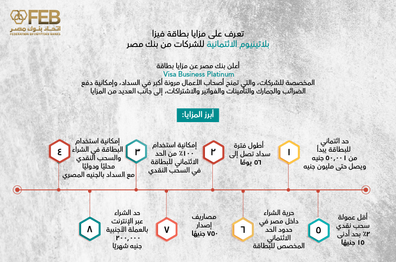 أعلن بنك مصر عن مزايا بطاقة Visa Business Platinum المخصصة للشركات، والتي تمنح أصحاب الأعمال مرونة أكبر في السداد، وإمكانية دفع الضرائب والجمارك والتأمينات والفواتير والاشتراكات، إلى جانب العديد من المزايا الأخرى.