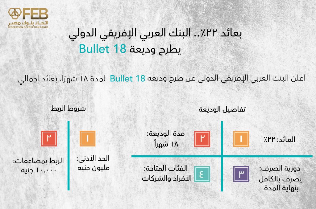 45 البنك العربي الإفريقي الدوليوديعة Bullet 18 0 تعليقات 0 FacebookTwitterLinkedinCopy LinkEmail البوست السابق ودائع عملاء بنك البركة – مصر ترتفع إلى 122.7 مليار جنيه بنهاية 2025 البوست القادم بنك القاهرة يرفع رأس مال كايرو للتمويل إلى 750 مليون جنيه قد يعجبك أيضاً نتائج أعمال البنك التجاري الدولي – مصر ((CIB خلال عام 2025 فبراير 11, 2026 نتائج أعمال مصرف أبو ظبي الإسلامي – مصر خلال عام 2025 فبراير 10, 2026 تعرف على تفاصيل أول برنامج بنكي لتمويل سيدات الأعمال من بنك نكست يناير 28, 2026 تفاصيل ومزايا برنامج تمويل الأطباء من المصرف المتحد يناير 28, 2026 تفاصيل ومزايا شهادة “سند الادخارية” من بنك ناصر الاجتماعي يناير 25, 2026 بعائد سنوي يُصرف شهريًا.. مميزات شهادة الذهب من البنك التجاري الدولي (CIB) يناير 6, 2026 إنستاباي تُطلق ميزة جديدة لمعرفة حدود الاستخدام والتحويلات في ثوانٍ يناير 4, 2026 بعائد شهري يناسب احتياجاتك .. تعرف على مميزات الشهادات البلاتينية من البنك الأهلي المصري يناير 4, 2026 تفاصيل ومزايا شهادة «ابن مصر» الثلاثية المتناقصة بعائد سنوي ديسمبر 31, 2025 نتائج أعمال البنك الأهلي المصري بنهاية سبتمبر 2025 ديسمبر 29, 2025