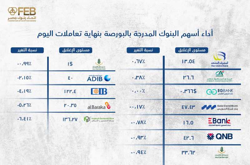 المصرف المتحد يتصدر ارتفاعات أسهم البنوك بالبورصة بنهاية تعاملات اليوم