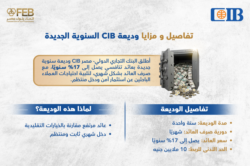 62 0 تعليقات 0 FacebookTwitterLinkedinCopy LinkEmail البوست السابق ميدبنك يطرح شهادة MID SMART بعائد سنوي متناقص أكثر من 20% يصرف شهريًا البوست القادم البنك المركزي: الاستثمار الأجنبي المباشر يحقق تدفقات بقيمة 9.3 مليار دولار خلال 6 أشهر قد يعجبك أيضاً نتائج أعمال بنك الإسكندرية خلال عام 2025 أبريل 14, 2026 تعرف على أداء أسهم قطاع البنوك المدرجة بالبورصة المصرية خلال جلسات الأسبوع الماضي أبريل 11, 2026 نتائج أعمال قوية لبنك QNB مصر خلال الربع الأول من 2026 أبريل 9, 2026 تطور احتياطي النقد الأجنبي في مصر الربع الأول 2026 أبريل 5, 2026 تفاصيل ومزايا شهادة ادخار “ثروة” من بنك التعمير والإسكان مارس 12, 2026 مزايا وتفاصيل الشهادة الثلاثية الجديدة من البنك الزراعي المصري مارس 8, 2026 مؤشرات نتائج أعمال بنك التعمير والإسكان خلال عام 2025 فبراير 15, 2026 بعائد 22%.. البنك العربي الإفريقي الدولي يطرح وديعة Bullet 18 فبراير 11, 2026 نتائج أعمال البنك التجاري الدولي – مصر ((CIB خلال عام 2025 فبراير 11, 2026 نتائج أعمال مصرف أبو ظبي الإسلامي – مصر خلال عام 2025 فبراير 10, 2026