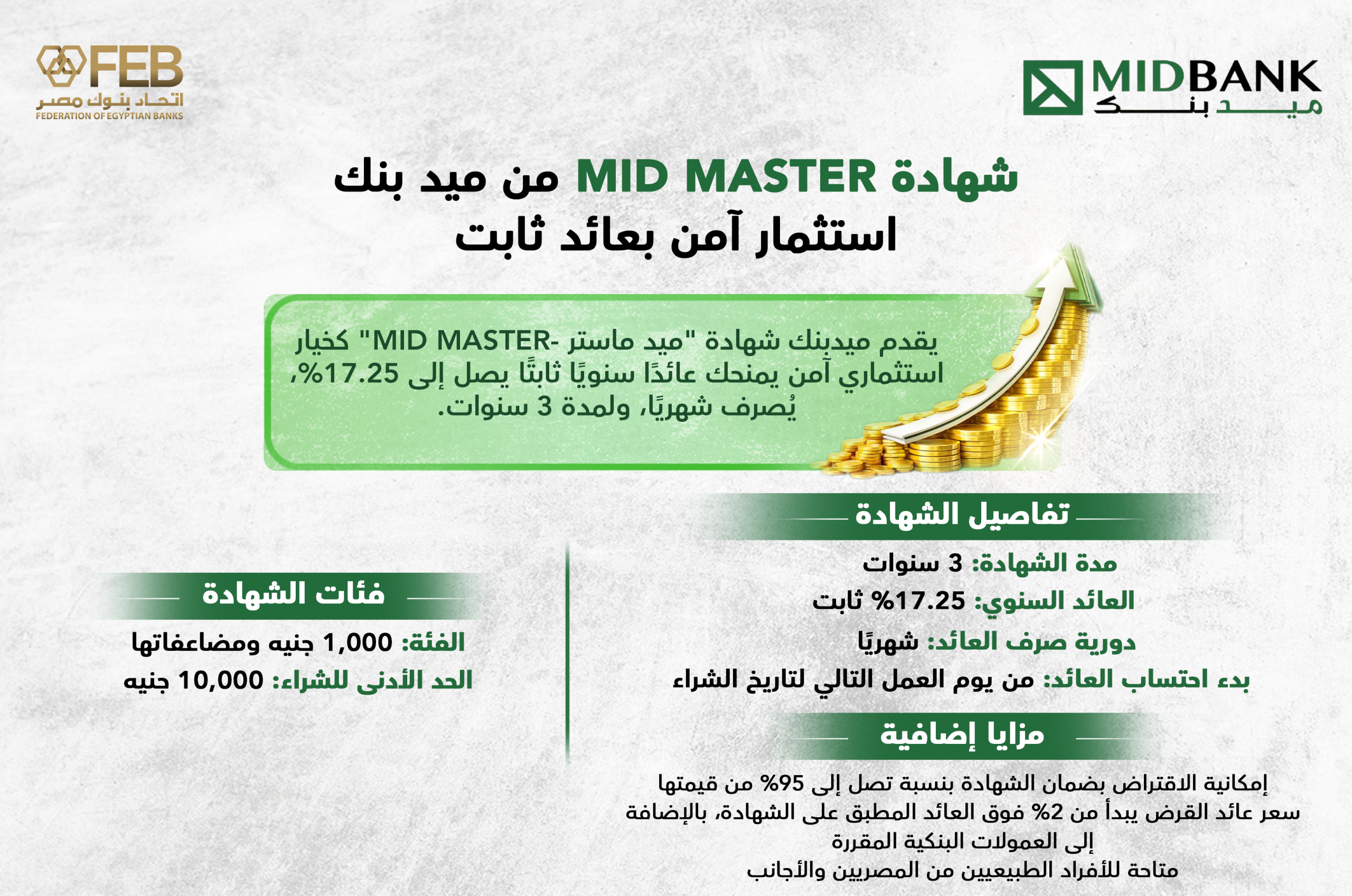 43 MID MASTERميد بنك 0 تعليقات 0 FacebookTwitterLinkedinCopy LinkEmail البوست السابق بنك التعمير والإسكان يتصدر ارتفاعات أسهم البنوك بالبورصة بنهاية تعاملات اليوم قد يعجبك أيضاً خريطة الربحية.. ترتيب البنوك المدرجة وفق ربحية السهم خلال 2025 أبريل 19, 2026 من يتصدر ؟ ترتيب البنوك في مصر وفقاً لحجم الأصول خلال 2025 أبريل 19, 2026 تفاصيل شهادة Advantage من بنك أبوظبي الأول – مصر بعائد 19.25% يُصرف شهريًا أبريل 17, 2026 شهادة MID SMART من ميد بنك استثمار ذكي بعائد متناقص يُصرف شهريًا أبريل 15, 2026 تفاصيل ومزايا وديعة CIB السنوية الجديدة 2026 أبريل 14, 2026 نتائج أعمال بنك الإسكندرية خلال عام 2025 أبريل 14, 2026 تعرف على أداء أسهم قطاع البنوك المدرجة بالبورصة المصرية خلال جلسات الأسبوع الماضي أبريل 11, 2026 نتائج أعمال قوية لبنك QNB مصر خلال الربع الأول من 2026 أبريل 9, 2026 تطور احتياطي النقد الأجنبي في مصر الربع الأول 2026 أبريل 5, 2026 تفاصيل ومزايا شهادة ادخار “ثروة” من بنك التعمير والإسكان مارس 12, 2026