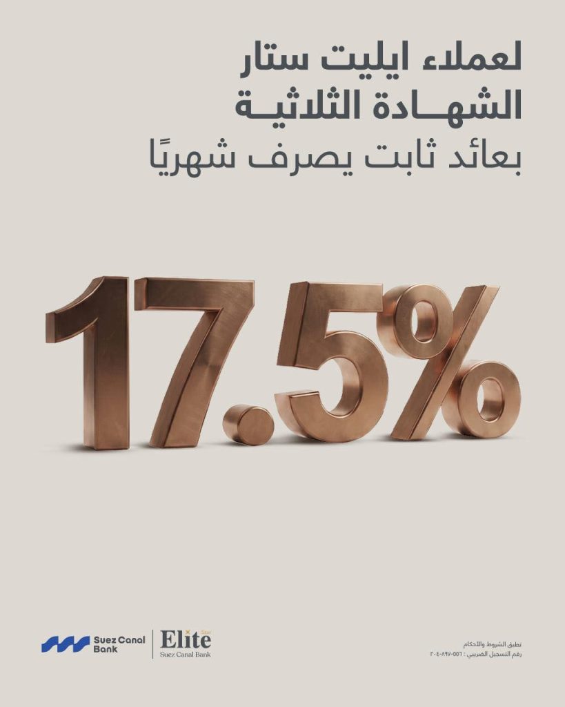 أعلن بنك قناة السويس عن طرح شهادة إدخار إيليت ستار بعائد سنوي ثابت 17.5% يصرف شهريًا.