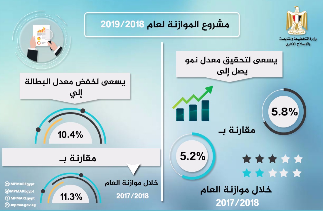 260. نشرت وزارة التخطيط والمتابعة والإصلاح الإداري على صفحتها عبر موقع التواصل الاجتماعي “فيسبوك” انفوجرافًا يوضح استهداف مشروع الموازنة لعام 2019/2018 لتحقيق معدل نمو يصل إلى 5.8% مقارنة بـ 5.3% خلال الربع الثاني من العام المالي الحالي 2017/2018.