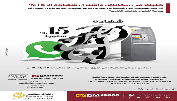 383. حرصًا من بنك مصر علي سلامه عملاءه، تمت إضافة إمكانية شراء شهادة ابن مصر من خلال ماكينات الصراف الآلي والواتس آب، حيث ينفرد بنك مصر بهذه الخدمة حصريًا لعملائه لتوفير سبل آمنة وسهلة للتعامل من خلال شبكة صراف اّلي منتشرة في جميع أنحاء الجمهورية.
