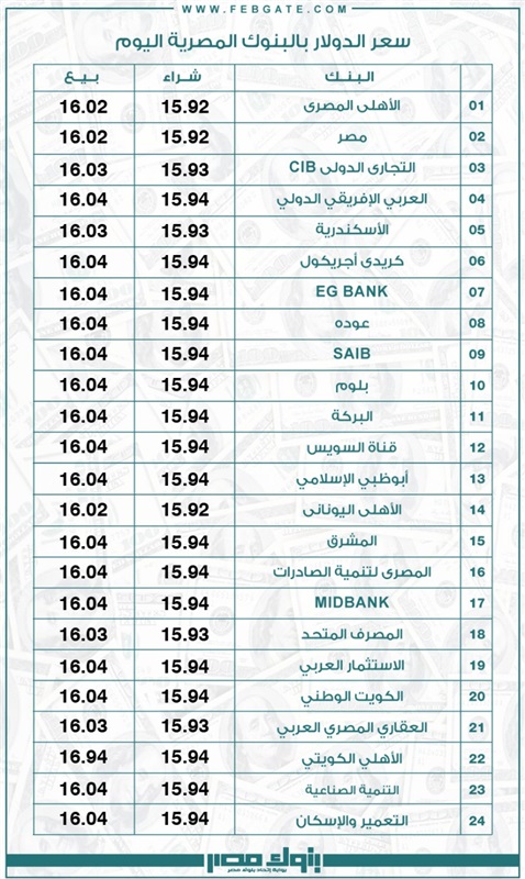 وفي مسح لـ”بنوك مصر” شمل 24 بنكًا عاملًا بالسوق المصرية، سجل أقل سعر لصرف الدولار في البنوك التالية (الأهلي المصري ـ مصر ـ الأهلي اليوناني) عند مستوى 15.92 جنيهًا للشراء، و16.02 جنيهًا للبيع.