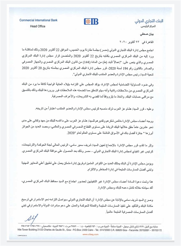 اجتمع مجلس إدارة البنك التجاري الدولي (مصر) بجلسة طارئة أمس، الخميس، الموافق 22 أكتوبر 2020، وذلك لمناقشة ما ورد إليه من البنك المركزي المصري بكتابه بتاريخ 22 أكتوبر 2020، والمتضمن قرار مجلس إدارة البنك المركزي المصري والذي ينص على: “إعمالاً للبند (ط) من المادة (144) من قانون البنك المركزي المصري والجهاز المصرفي، والصادر بالقانون رقم 194 لسنة 2020، قرر مجلس إدارة البنك المركزي المصري بجلسته بتاريخ 20 أكتوبر 2020 تنحية رئيس مجلس الإدارة، العضو المنتدب للبنك التجاري الدولي”.
