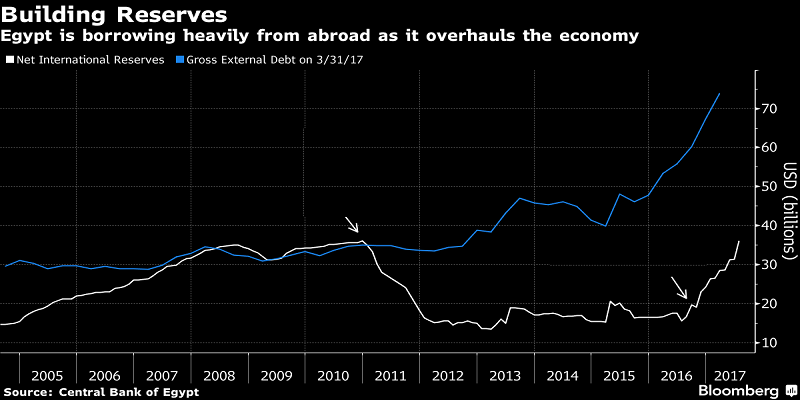 وأوضح تقرير “بلومبرج” أن الاحتياطيات النقدية فى مصر شهدت تراجعا فى السنوات الاخيرة، تحديدا منذ بداية عام 2011. وعلى الرغم من انتعاش الاحتياطيات منذ بدء برنامج الاصلاح الاقتصادى، إلا أن العملة الضعيفة المقترنة بتخفيضات دعم الوقود ساعد على دفع التضخم إلى ما يزيد على 30٪. الامر الذى دفع البنك المركزي إلى رفع أسعار الفائدة بنسبة 7% بداية من نوفمبر الماضى. إلا أن الدين الخارجي المصري قد ارتفع إلى 73.9 مليار دولار في مارس من 53.4 مليار دولار في العام السابق.