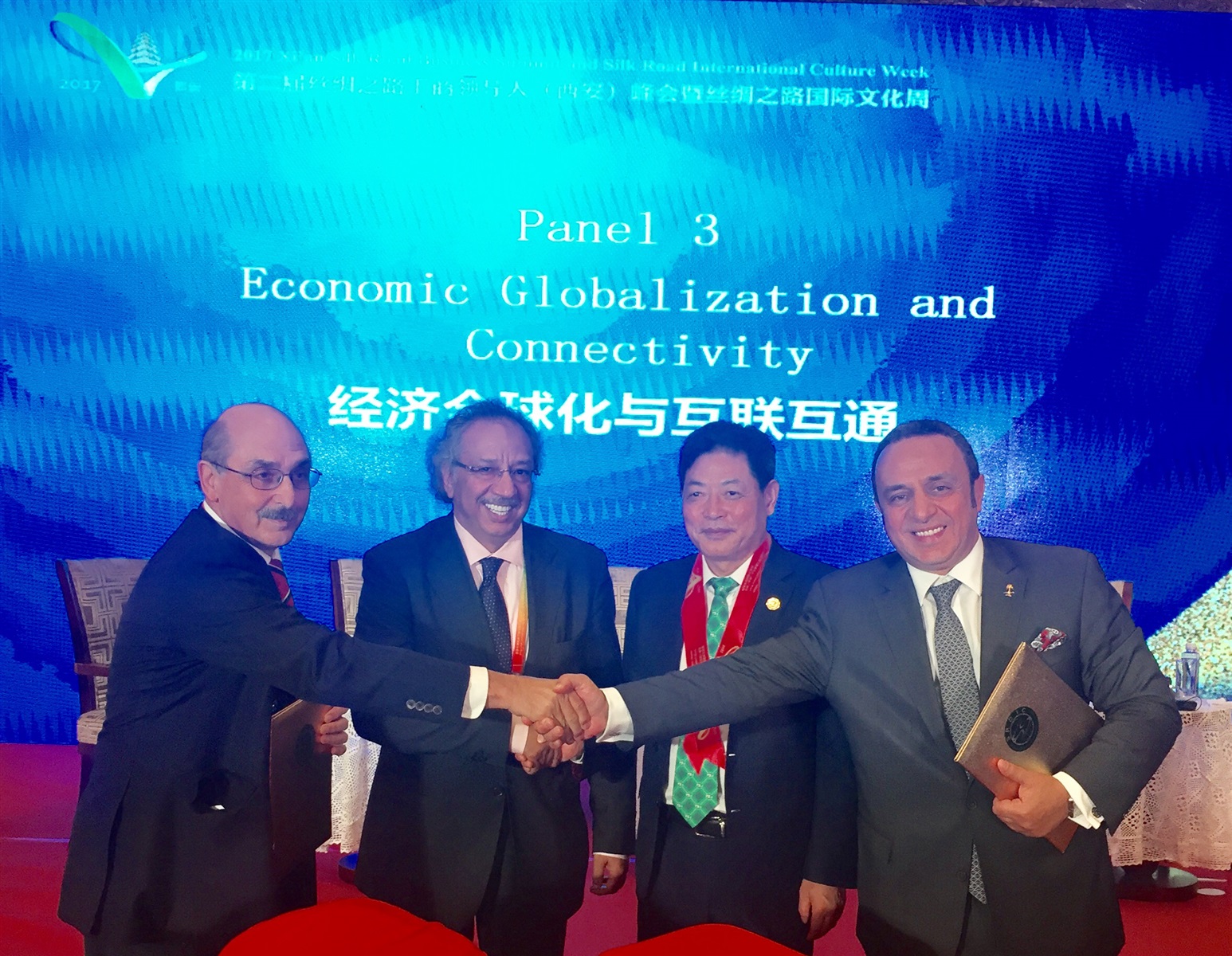 249. وقع وسام فتوح، الأمين العام لاتحاد المصارف العربية، وجان غى كارييه، ورئيس مجلس الإدارة التنفيذى لغرفة طريق الحرير للتجارة العالمية، مذكرة تعاون، وذلك خلال انعقاد قمة التجارة العالمية لطريق الحرير 2017، في ولاية غزيان، شمال الصين.