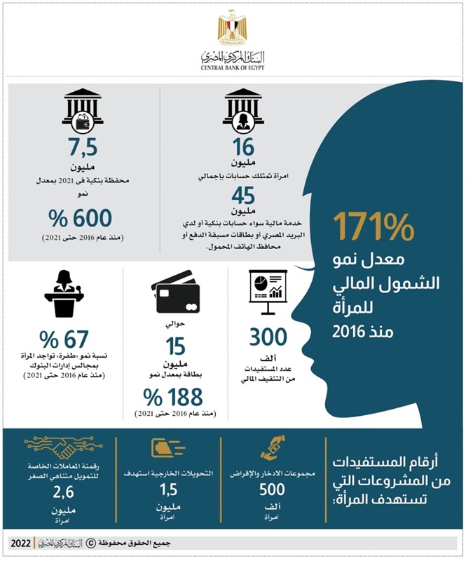 وأظهرت البيانات أن الفترة من 2016 وحتى نهاية 2021، شهدت مضاعفة البنك المركزي لجهوده في تحقيق الشمول المالي والتمكين الاقتصادي للمرأة، حيث أصدر العديد من القرارات والمبادرات لتحقيق هذا الهدف، منها قرار حوكمة مجالس إدارات البنوك والذي ألزم فيه البنوك بتواجد سيدتين على الاقل في مجلس إدارة كل بنك.