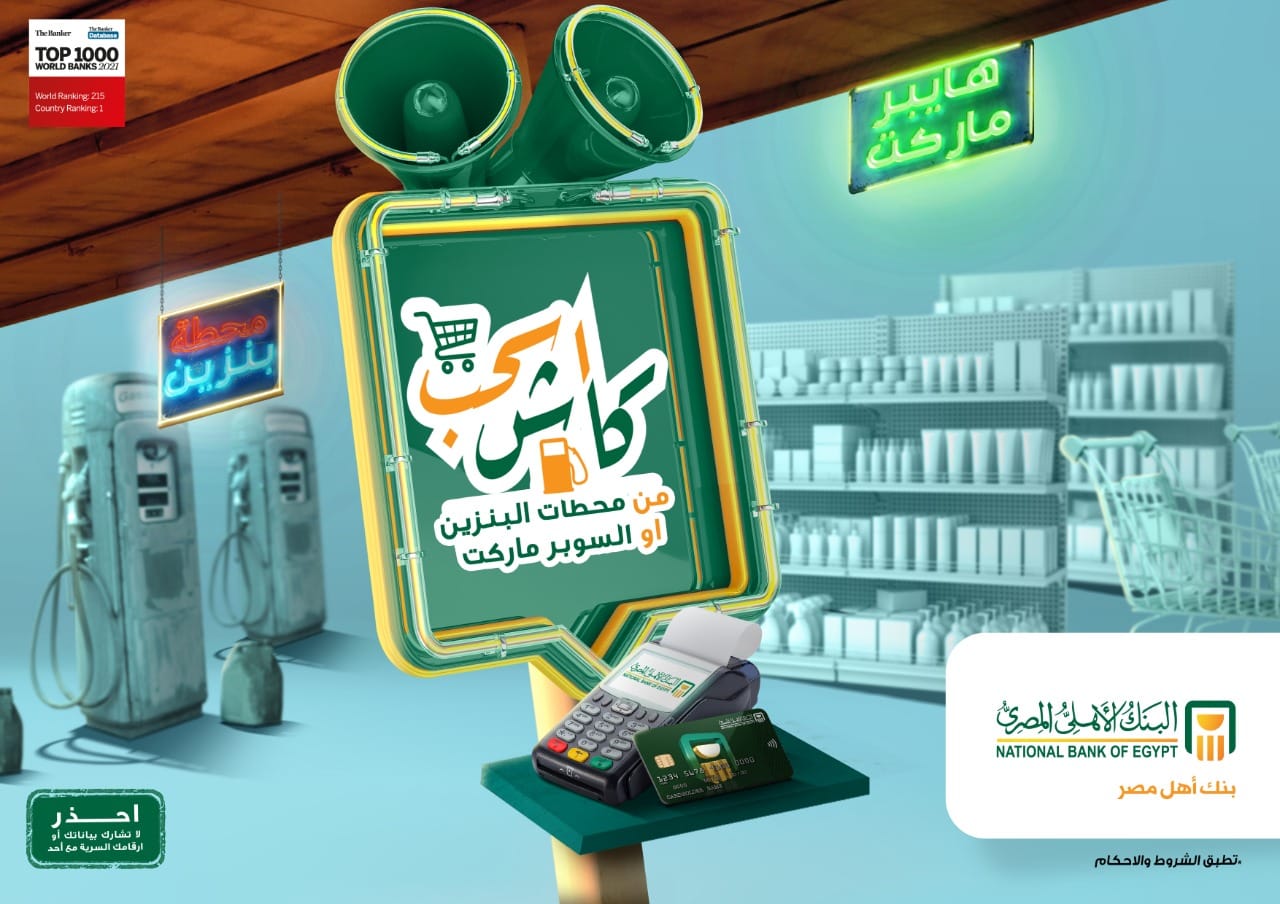 355. لأول مرة في مصر، أعلن البنك الأهلي المصري، لعملائه، عن إمكانية سحب الأموال أو المعاش مع خدمة كاش أواي من محطات البنزين، أو أي سوبر ماركت.
