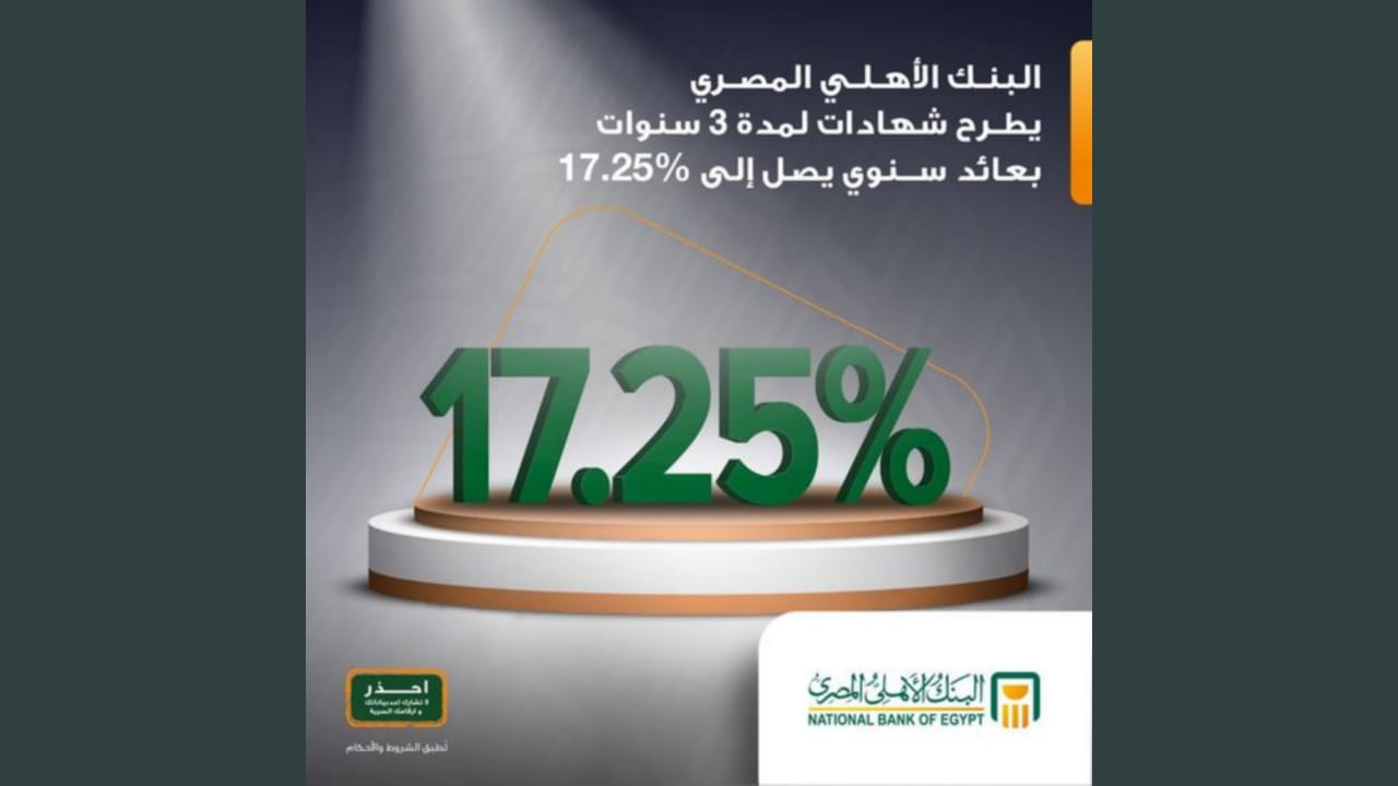 وكان قد قرر البنك الأهلي المصري طرح شهادة جديدة بعائد مرتفع، ووجاء ذلك بعد أن أعلن البنك المركزي المصري يوم، الخميس الماضي، في اجتماع استثنائي، رفع سعري عائد الإيداع والإقراض لليلة واحدة، وسعر العملية الرئيسية للبنك المركزي بواقع 200 نقطة أساس، ليصل إلى 13.25% و14.25% و13.75% على الترتيب.