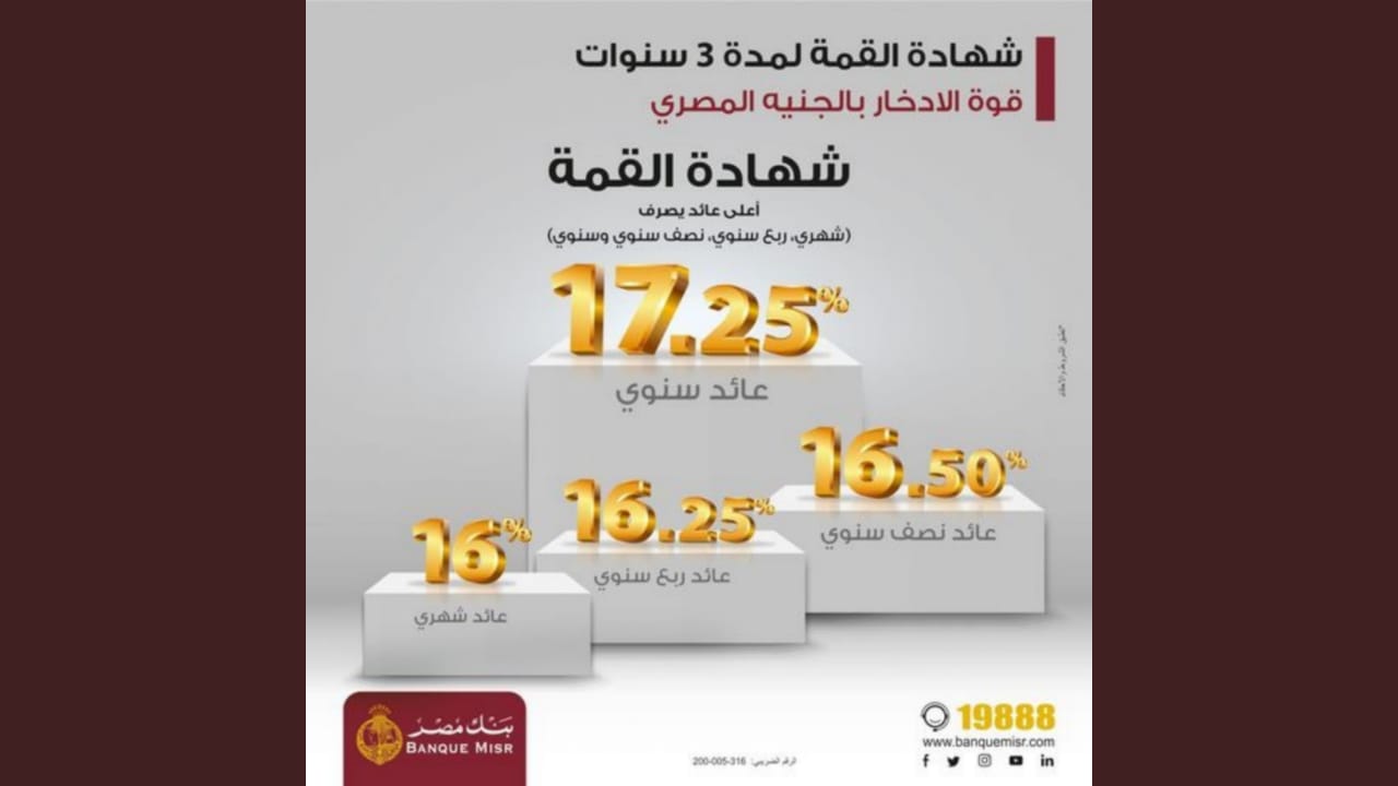 أعلن بنك مصر، عبر صفحته الرسمية على موقع التواصل الاجتماعي “فيسبوك” عن مزايا وخصائص شهادة القمة الثلاثية الجديدة، حيث تتيح الشهادة عائدا يصل إلى 17.25%، وبدوريات صرف متنوعة، وبحد أدنى 1000 جنيه لشراء الشهادة.